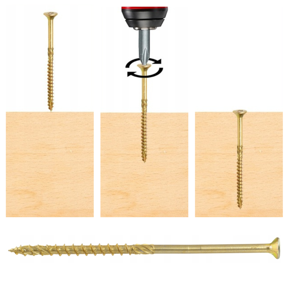- Nie ma potrzeby wstępnego nawiercania – specjalne nacięcie frezujące na końcu wkrętu ułatwia wejście w materiał i zmniejsza ryzyko pęknięcia drewna.