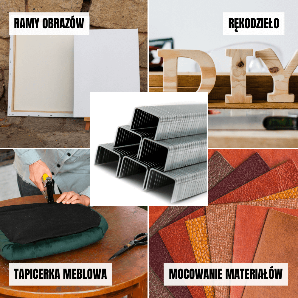 - Produkcja mebli tapicerowanych: Przy mocowaniu tkanin, skóry naturalnej i materiałów syntetycznych do drewnianych stelaży. Używane są m.in. przy montażu siedzisk, oparć, boków mebli, stelaży tapicerskich oraz elementów wykończeniowych w kanapach, fotelach czy łóżkach.